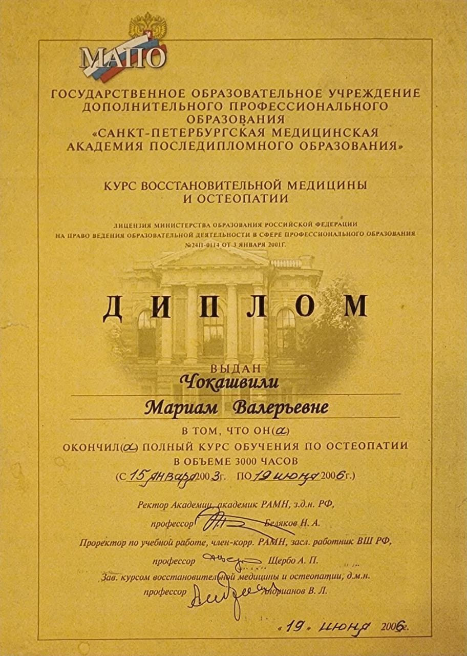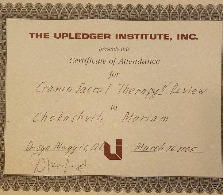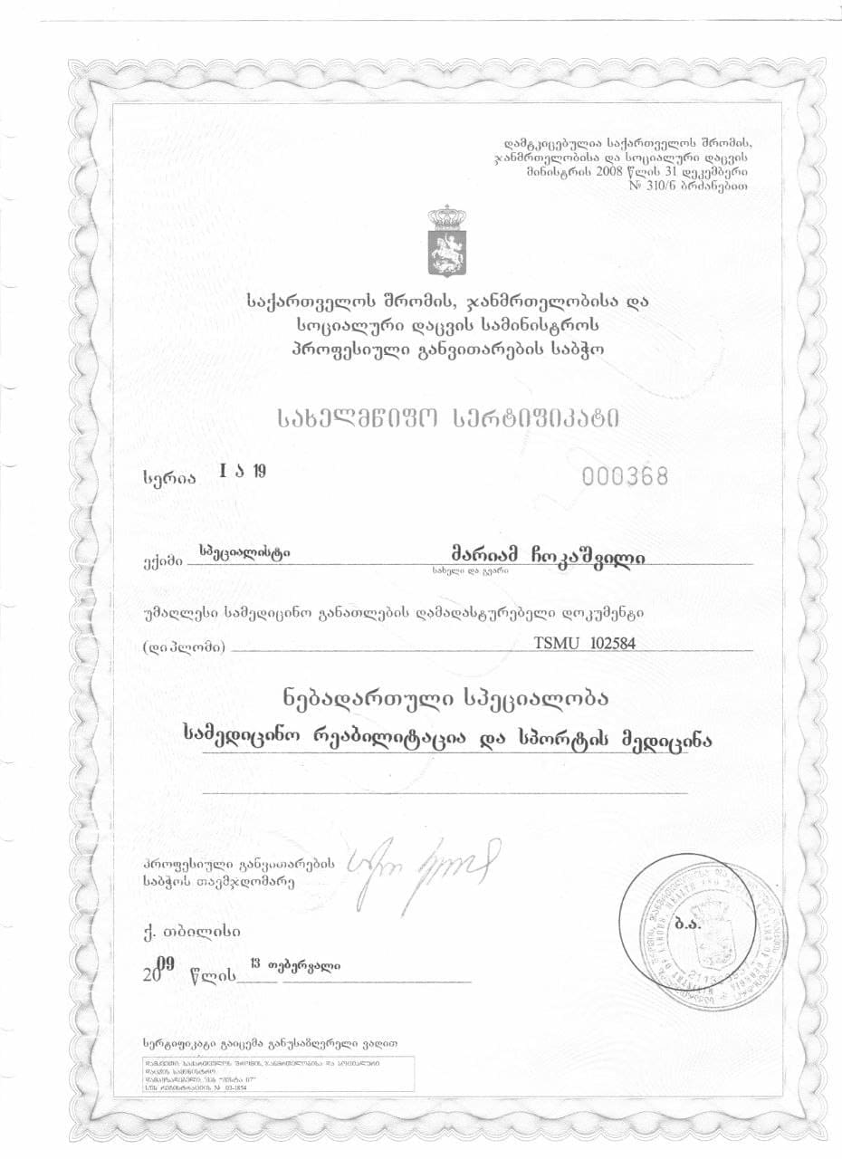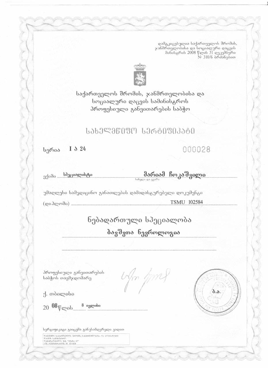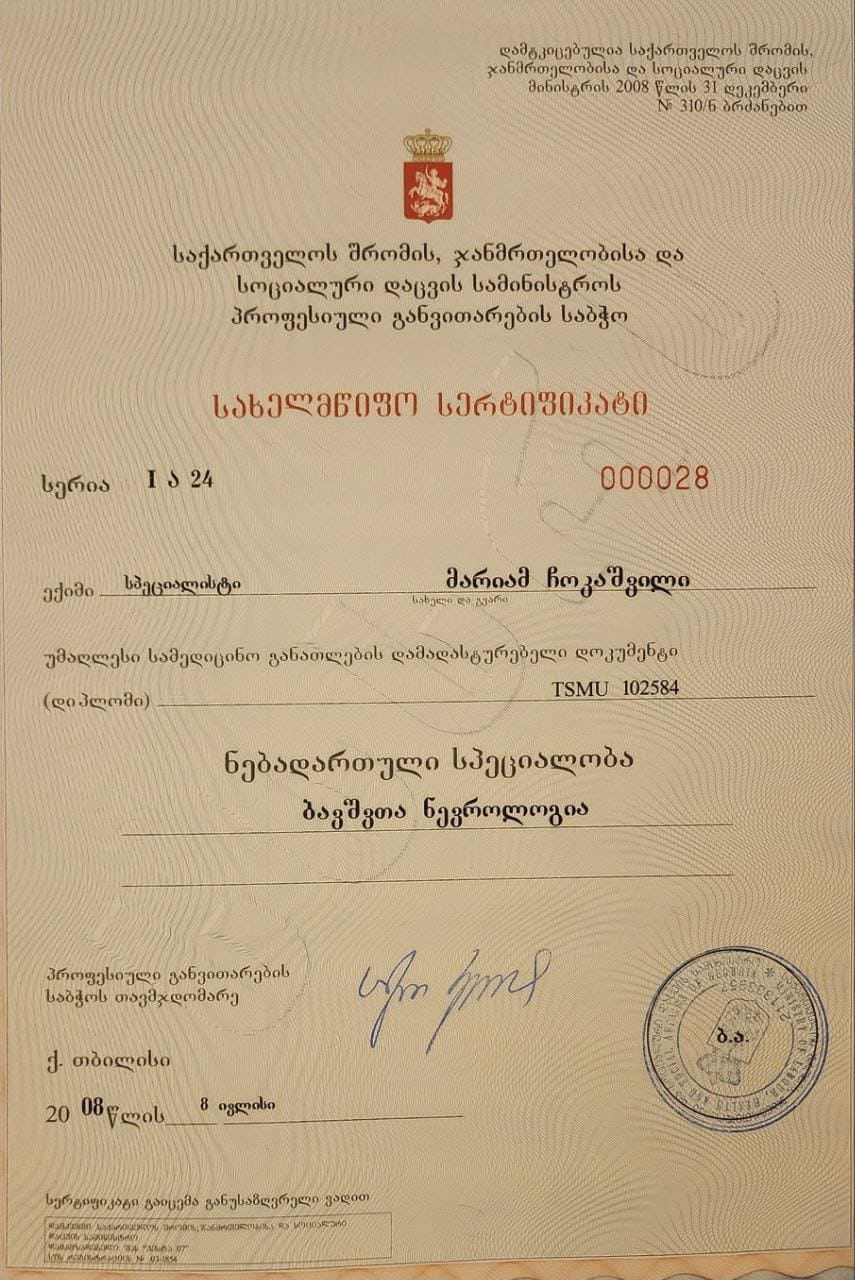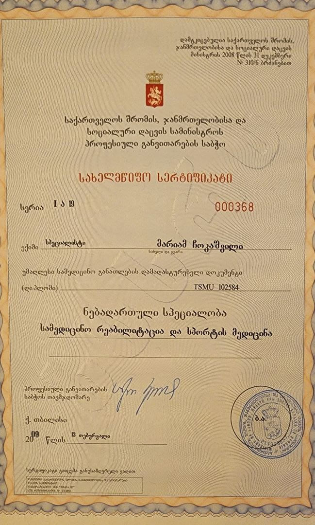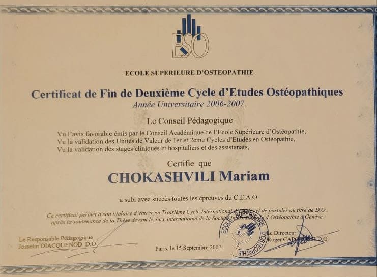 ვარ დიპლომირებული და სერტიფიცირებული ექიმი ოსტეოპათი და ბავშვთა ნევროლოგი. სამედიცინო პრაქტიკას ვახორციელებ ორ კლინიკაში. ვმუშაობ რთულ და ქრონიკულ პაციენტებთან, ორსულებთან, ახალშობილებთან, ბავშვებთან, ზრდასრულებთან და ასაკოვან პიროვნებებთან.