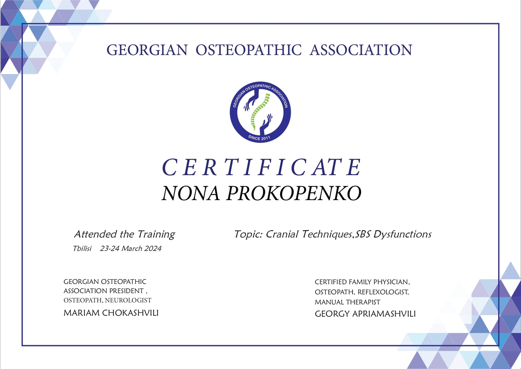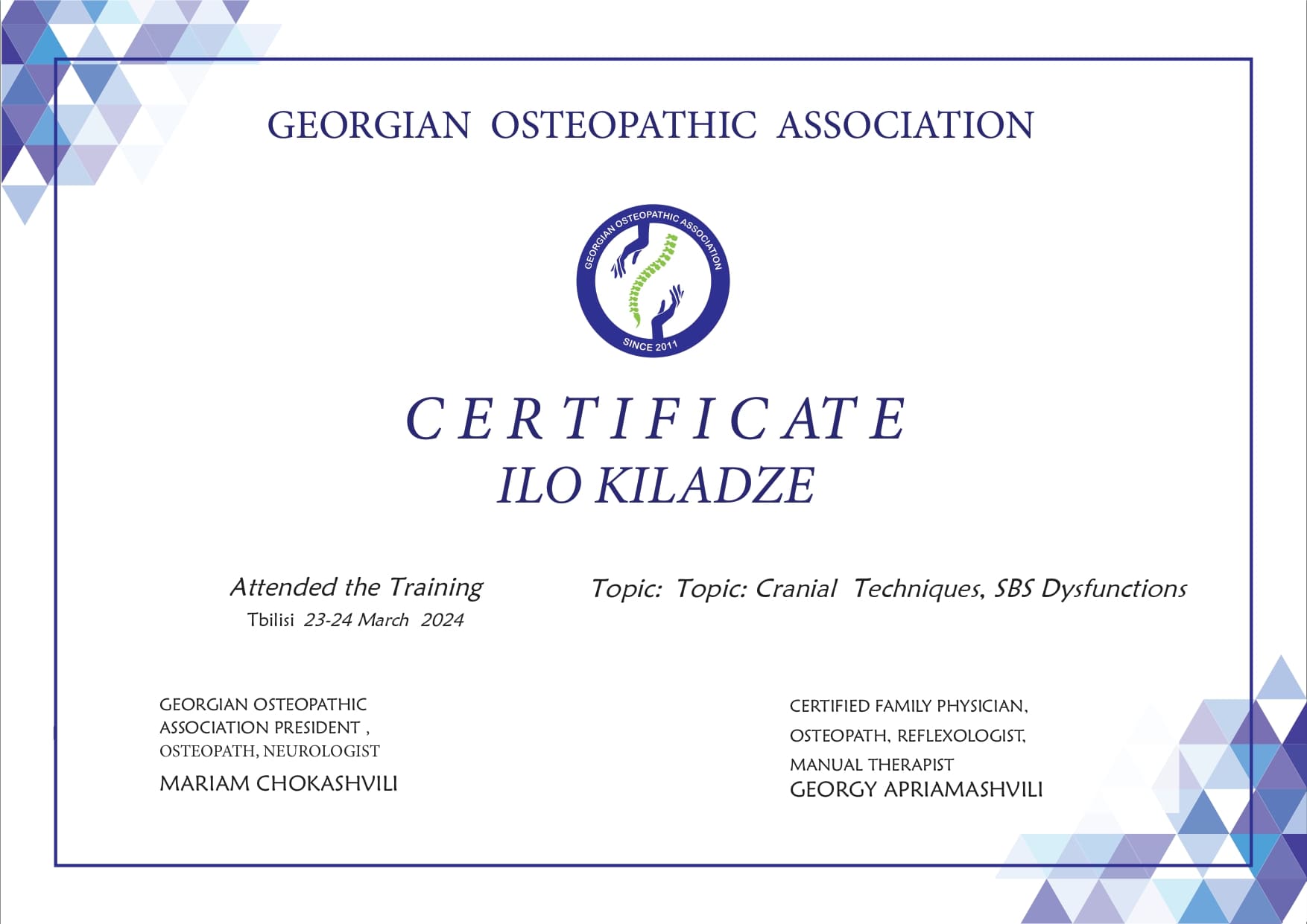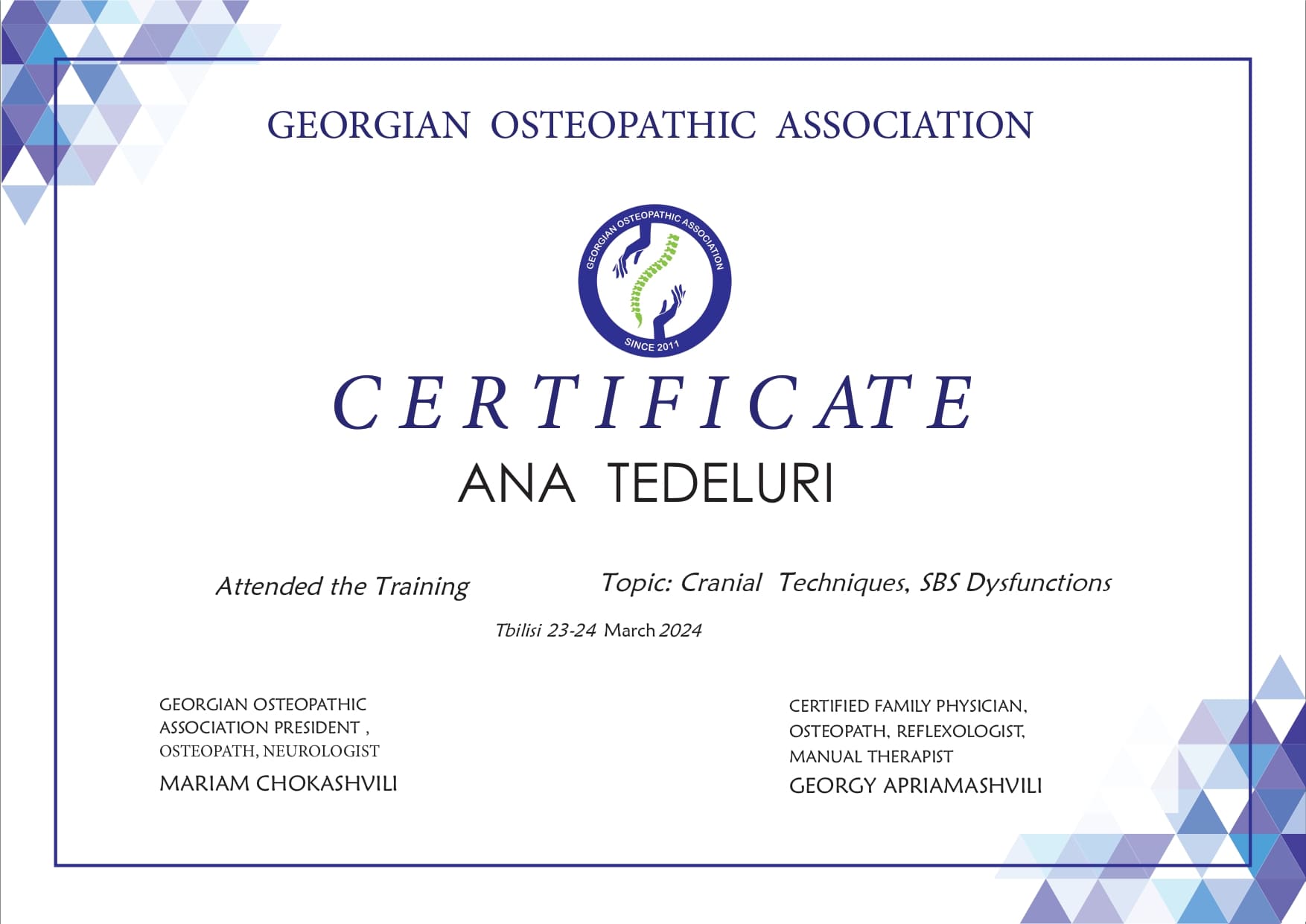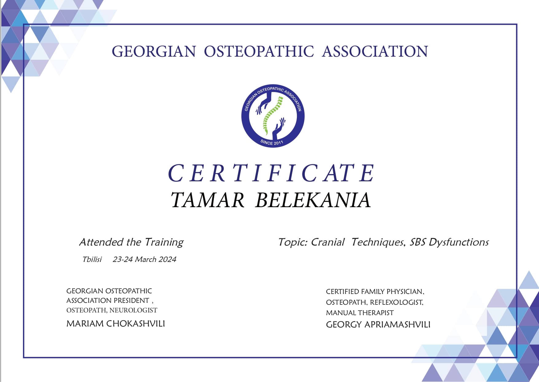 ვარ დიპლომირებული და სერტიფიცირებული ექიმი ოსტეოპათი და ბავშვთა ნევროლოგი. სამედიცინო პრაქტიკას ვახორციელებ ორ კლინიკაში. ვმუშაობ რთულ და ქრონიკულ პაციენტებთან, ორსულებთან, ახალშობილებთან, ბავშვებთან, ზრდასრულებთან და ასაკოვან პიროვნებებთან.