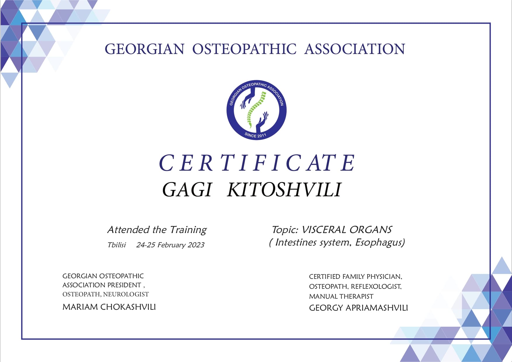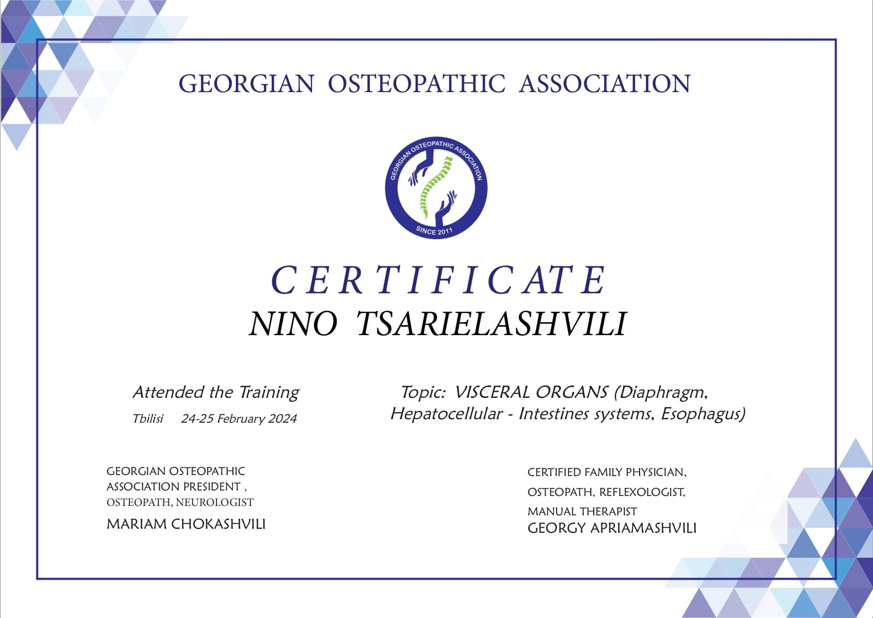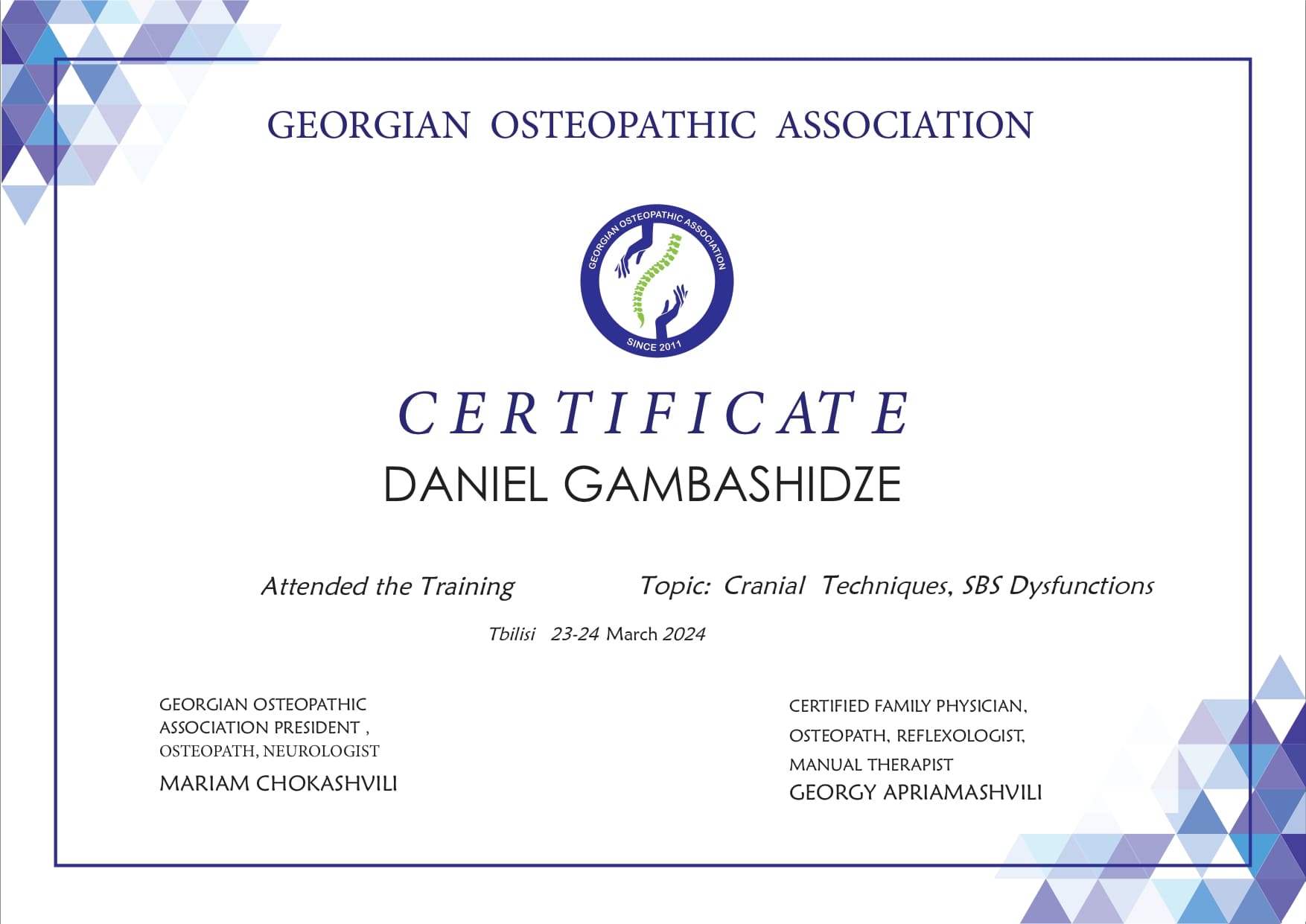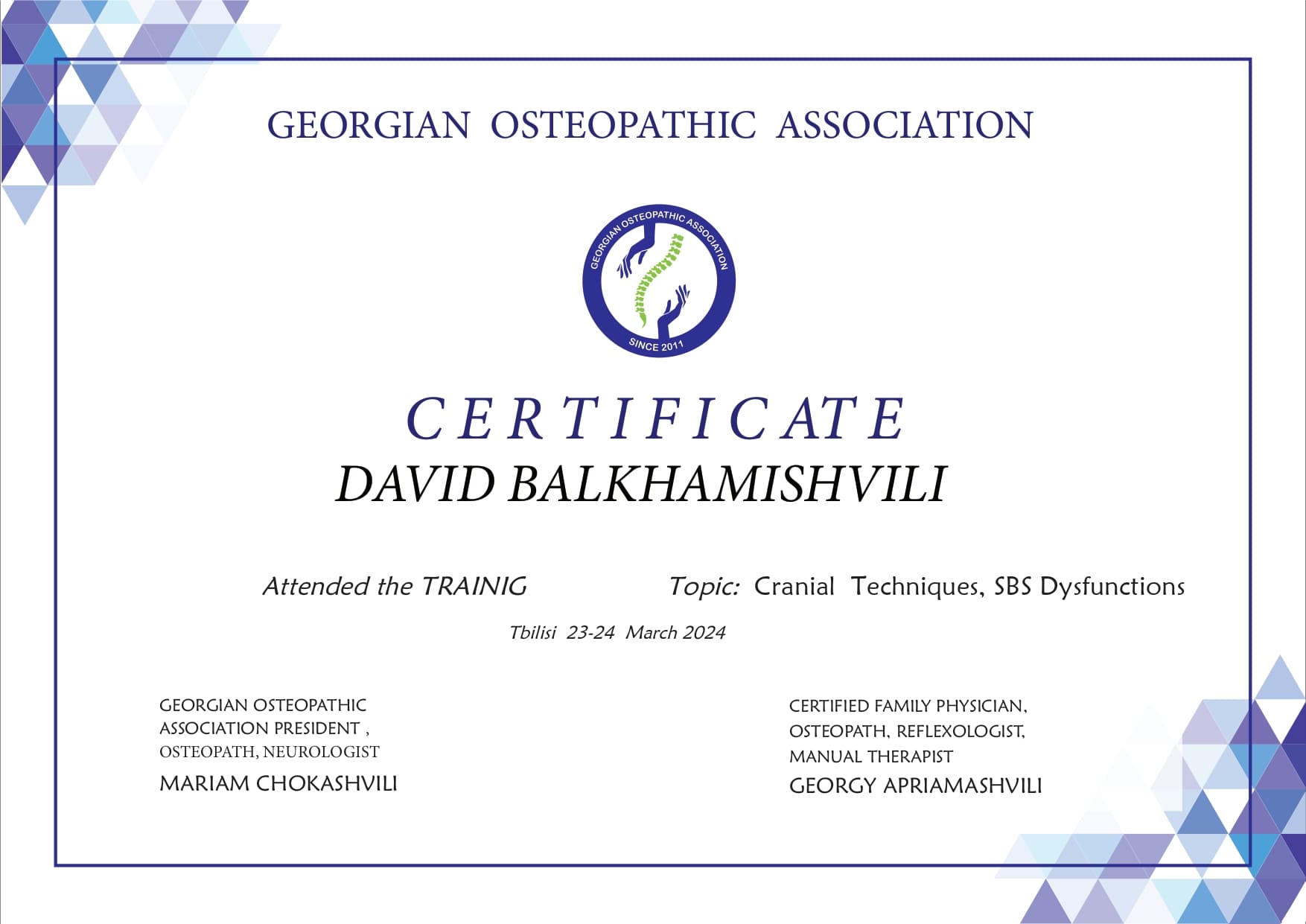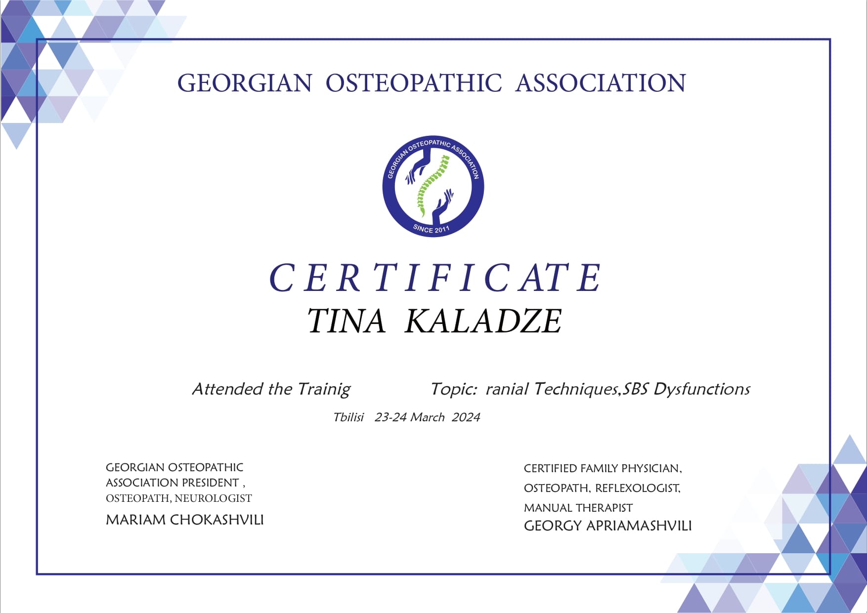 ვარ დიპლომირებული და სერტიფიცირებული ექიმი ოსტეოპათი და ბავშვთა ნევროლოგი. სამედიცინო პრაქტიკას ვახორციელებ ორ კლინიკაში. ვმუშაობ რთულ და ქრონიკულ პაციენტებთან, ორსულებთან, ახალშობილებთან, ბავშვებთან, ზრდასრულებთან და ასაკოვან პიროვნებებთან.