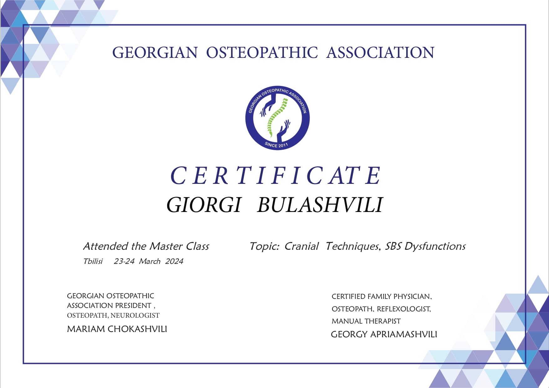 დაფუძნებულია 2011 წელს. ასოციაცია აერთიანებს ოსტეოპათებს საქართველოში. უზრუნველყოფს სტანდარტს, განათლებასა და სერტიფიცირებას ოსტეოპათიის სფეროში.